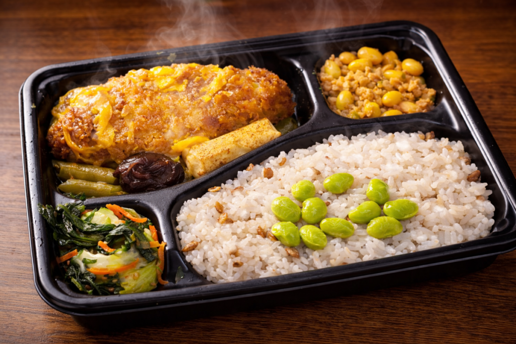 鮮やかな緑色が加わることで、 お弁当全体が明るくやさしい雰囲気になります。 副菜には、野菜を使ったおかずや 体にうれしい豆のおかずも入れて、 彩りだけでなく栄養のバランスにも配慮されています✨